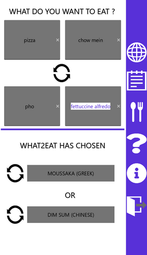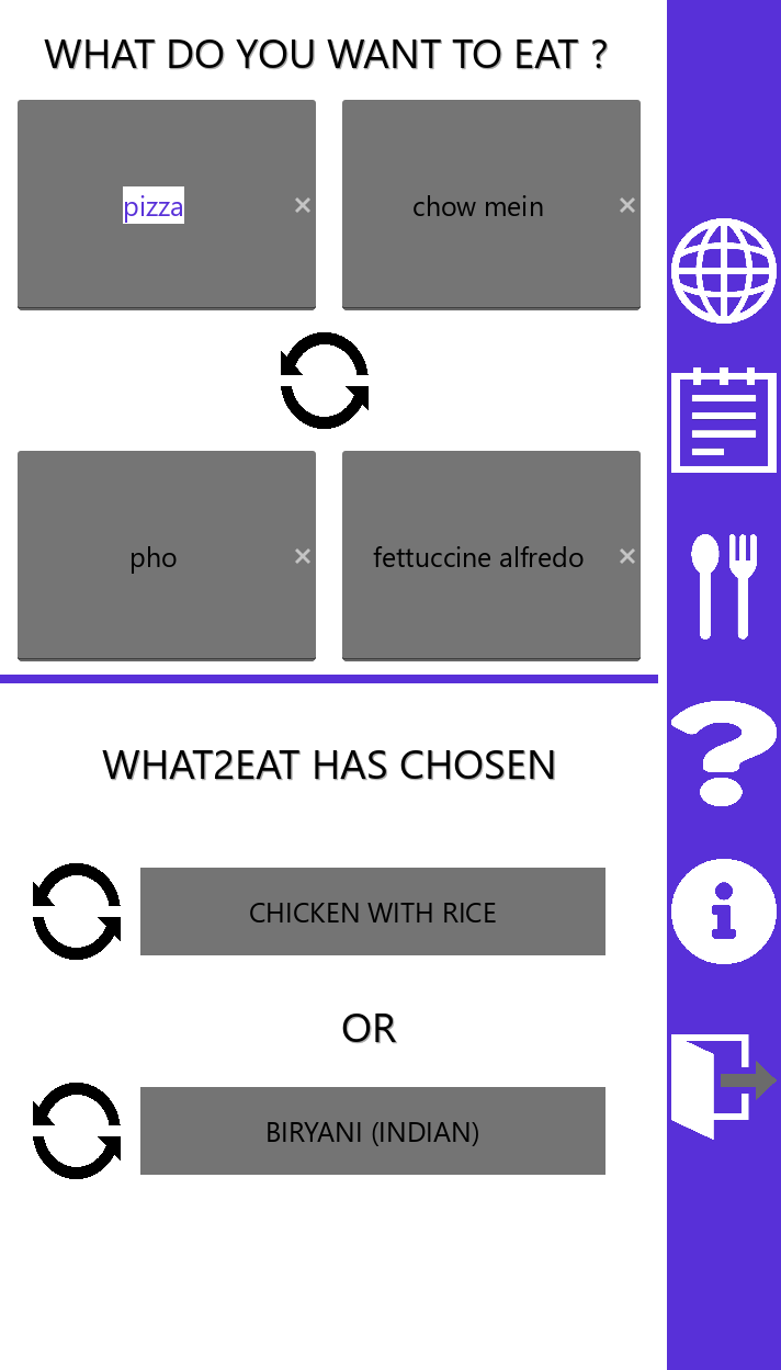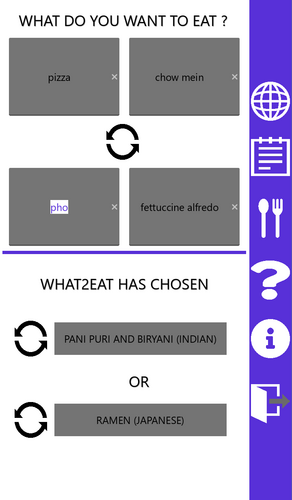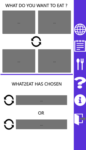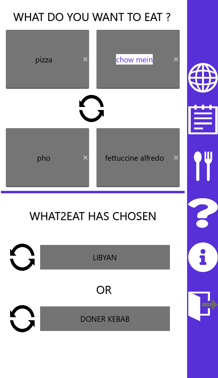 What 2 Eat is an app that will choose what you eat. The app offers a manual mode choice mode and an automatic choice mode. As well as a food journal to track what you eat.